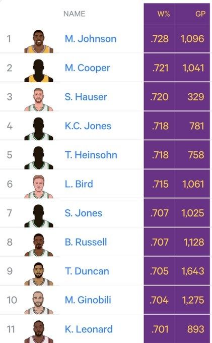 莱昂纳德在加盟快船之前胜率425胜153负(含季后赛),胜率73.5%历史第一,如今生涯战绩626胜268负,胜率70%,已经跌出胜率前10。